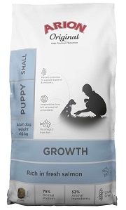 ARION Original Growth Fish Small er et hvalpefoder, udviklet til at dække det større behov for næring og energi, som hvalpe af små hunderacer har. Bruges indtil 12 måneders alderen samt til drægtige og diegivende tæver. ARION Original Growth Fish Small indeholder Ω3 fedtsyren DHA fra fiskeolie for at støtte hjernens udvikling og indlæringsevne hos hvalpe.