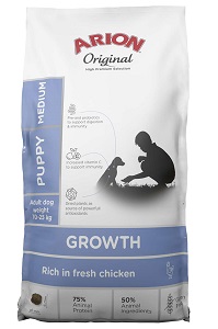 ARION Original Growth Chicken Large er et hvalpefoder, udviklet til at dække nærings- og energibehovet, for hvalpe af store hunderacer indtil 18 måneders alderen. Bruges ikke til drægtige og diegivende tæver. ARION Original Growth Chicken Large indeholder Ω3-fedtsyre er DHA. fra fiskeolie for at støtte hjernens udvikling og indlæringsevne hos hvalpe.