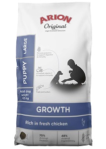 ARION Original Growth Chicken Large er et hvalpefoder, udviklet til at dække nærings- og energibehovet, for hvalpe af store hunderacer indtil 18 måneders alderen. Bruges ikke til drægtige og diegivende tæver. ARION Original Growth Chicken Large indeholder Ω3-fedtsyre DHA fra fiskeolie for at støtte hjernens udvikling og indlæringsevne hos hvalpe.